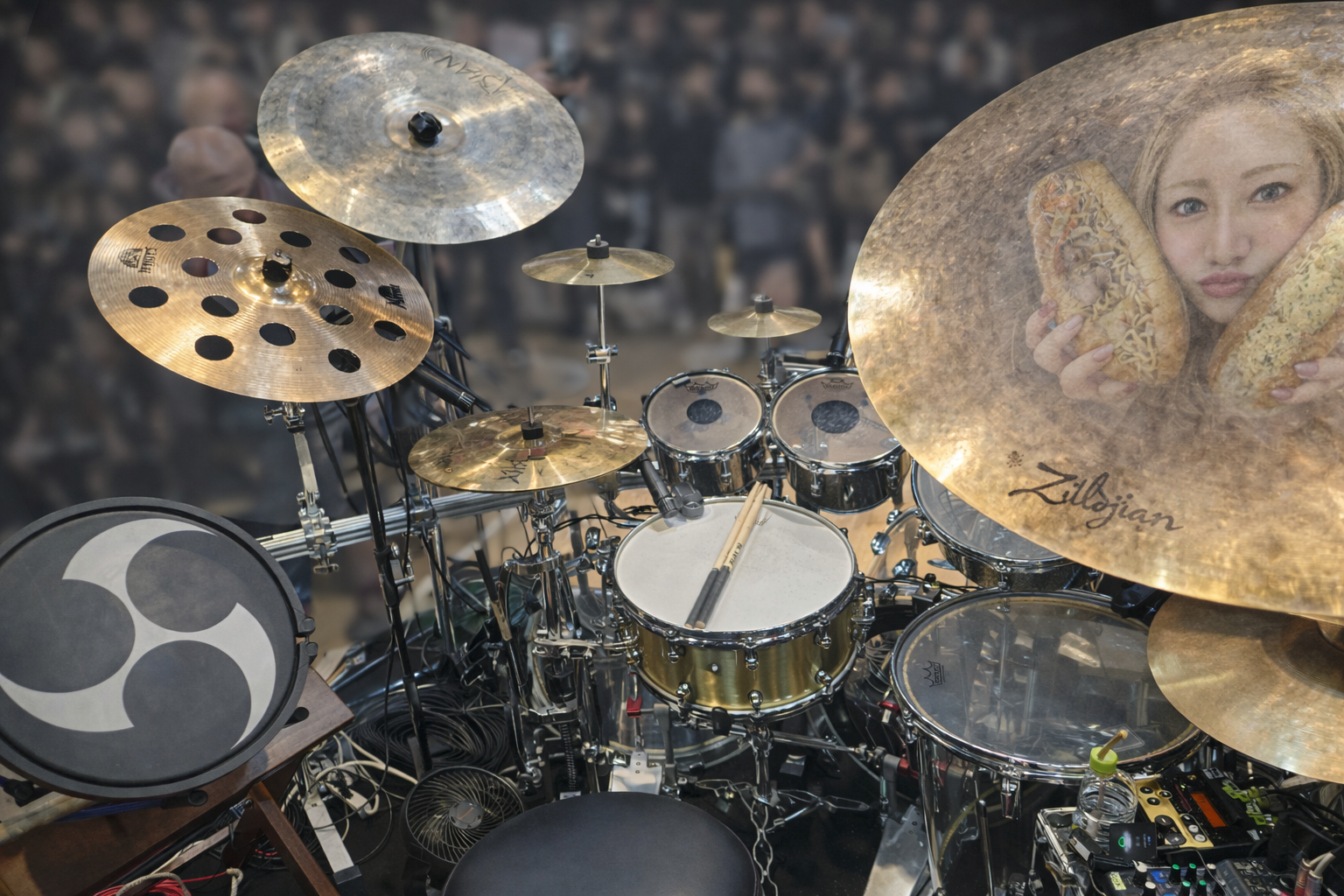 とにかくツーバスを踏みっぱなしで、驚異の手数でおかずやスティック回しまで放り込んでくるあたりは、もはや巨匠の領域。あと、トークでもありましたが、叩くべきところを端折らず、確実にバチンと狙ったところをヒットする。メロタムやツインペダルがどうこうという話は素人にはわかりませんが、絶対に飽きさせず、いちいち魅せてくれますし、超難曲「Dystopia Symphony」のところで記したように、Haruna氏はとにかくエモーショナル。セットはもはや要塞のように複雑ですが、コレを使いこなしてしまうあたりが才媛の凄みではないでしょうか。参考までにかの有名なツイートを貼らせていただきます。ぜひ現在と比べてみてください。