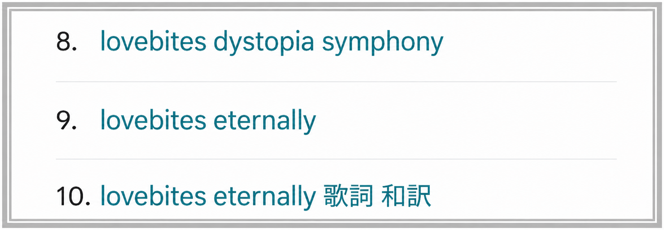 で、相変わらず、私は「Outsatanding Power」ばかり聴いている訳ですが、この日記の直近14日間の検索ワードランキングはこんな感じになっています。もう武道館公演が終わって1カ月になりますか。8~10位はこんな感じです。ちなみに、1~7位はネットフリックスで映画『爆弾』が観られるようになった影響があって、それがらみのキーワードばかり。佐藤二朗さんが怪人「スズキタゴサク」を演じたあの問題作です。そのため、かなりゲスい言葉が多く、スクリーンショットは自粛させていただきました。しかし、それに混ざって「Eternally」が検索上位にくるということは、武道館公演のインパクトはそれだけ強烈だったということでしょう。ライブ直後、思い入れたっぷりに感想を書かせていただいた甲斐がありました。で、なぜだ? このスクリーンショットを撮った日に限って「Dystopia Symphony」が急上昇していました笑 こうやって幅広い楽曲が愛されるところも、LOVEBITESのLOVEBITESたる所以なのかもしれません。