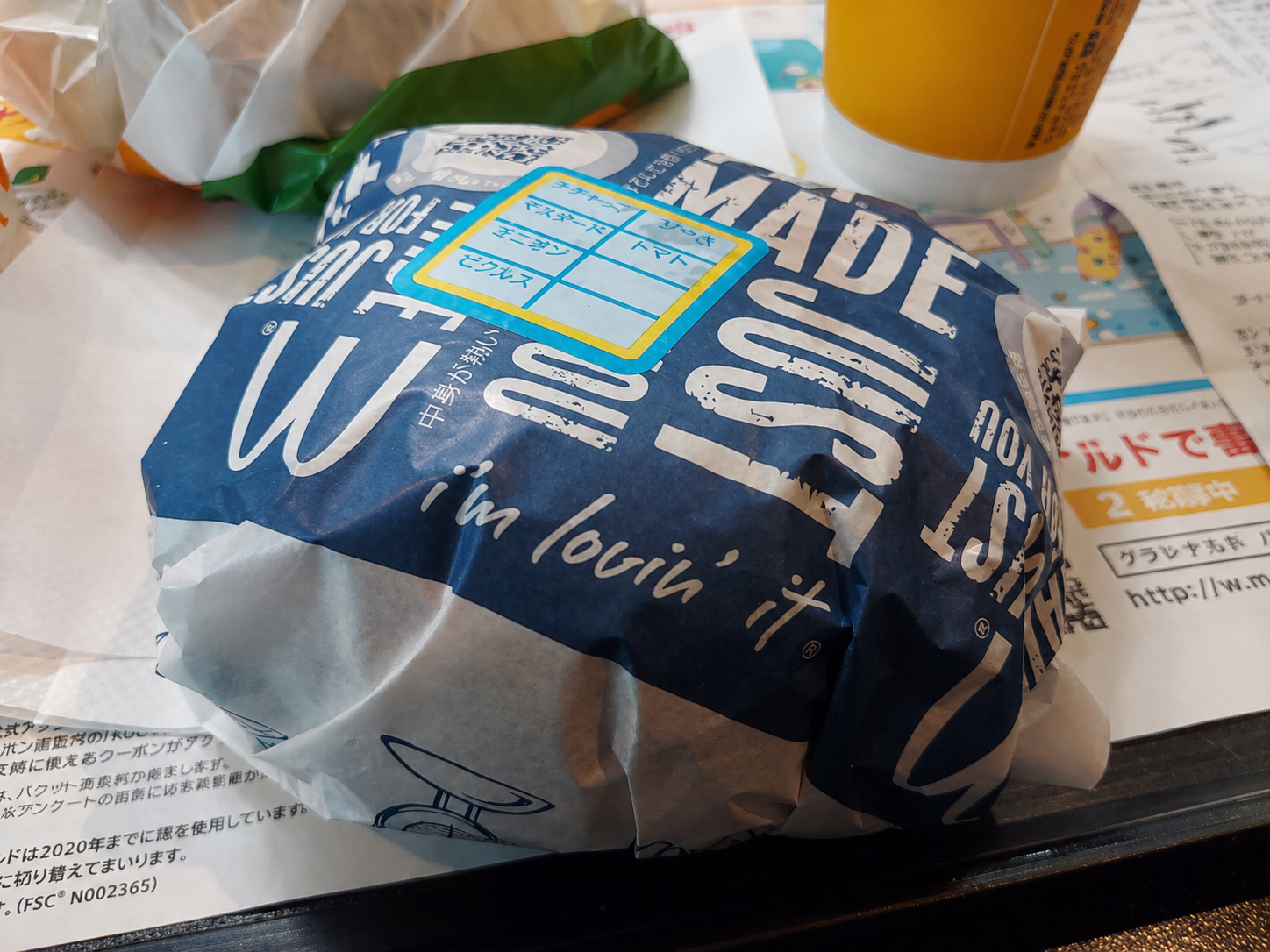 100円マック時代の普通のハンバーガー。包み紙が切れていて、青いレアな包装になったので、写真を残してありました