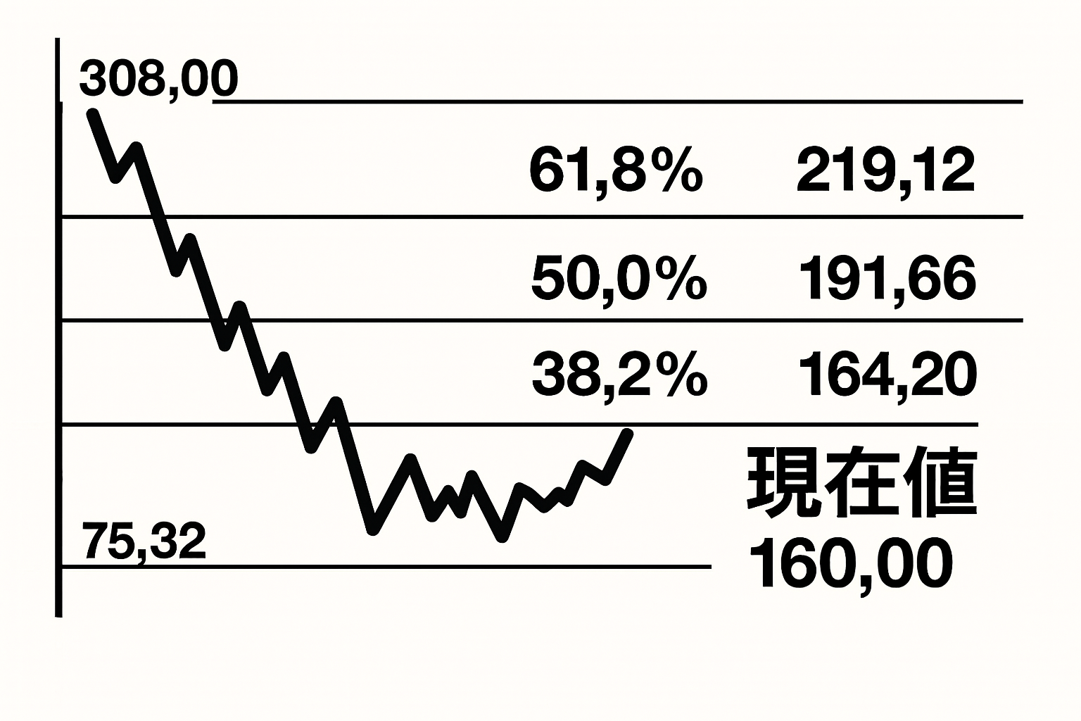 現在のドル/円相場は、スミソニアン体制下の新固定相場「1ドル=308.00円」から2011年に記録した最安値の75.32円まで下落した後、大きなリバウンド局面にあるとして、フィボナッチの38.2%・50%・61.8%戻しをそれぞれ算出してくれ。