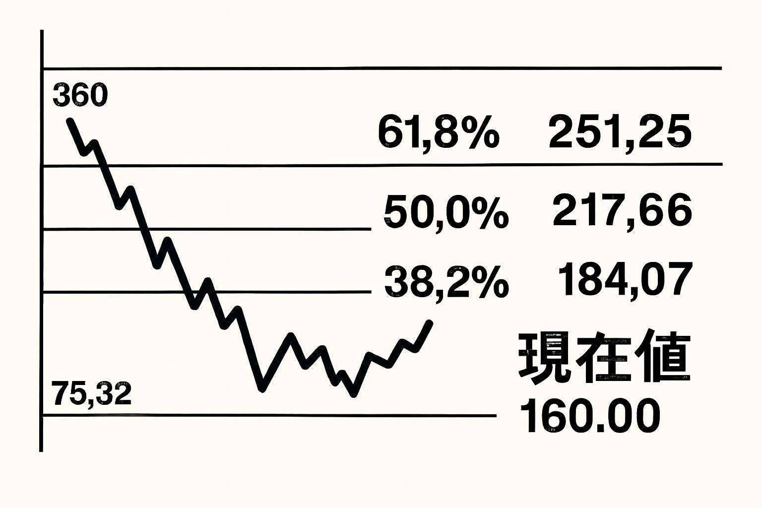 現在のドル/円相場は、固定相場制の360円から2011年に記録した最安値の75円32銭まで下落した後、大きなリバウンド局面にあるとして、フィボナッチの38.2%・50%・61.8%戻しをそれぞれ算出してくれ。